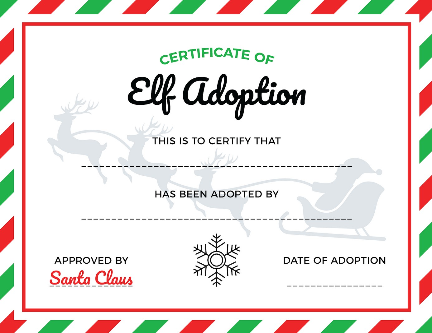 - Elf Adoption Letter (PDF, US Letter): space to personalize child’s name, adopted elf’s name, date, and it has an “Official North Pole” signature from Santa himself.