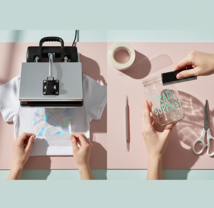 HTV is a vinyl film with a heat-activated adhesive on the back. The adhesive stays dormant until you apply heat + firm pressure with a heat press or household iron. Most HTV sheets have a clear shiny carrier sheet on top that acts like built-in transfer tape. You cut the design in reverse (mirror), weed the excess, and press. After pressing, you peel the carrier hot, warm, or cool depending on the brand/type.